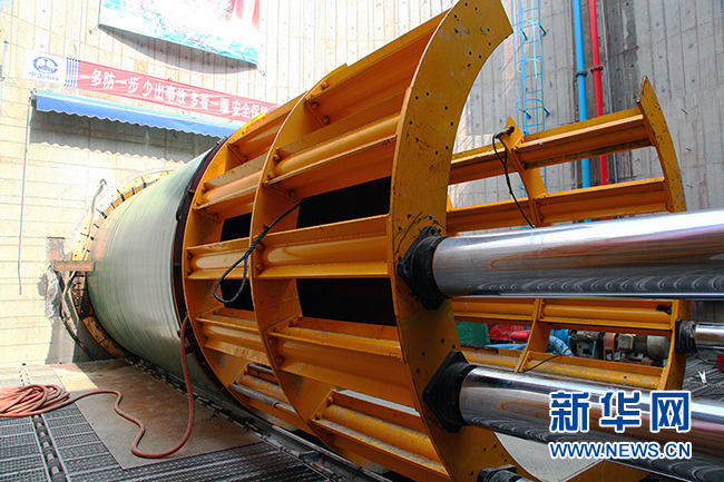 圖為沉井內(nèi)即將整體推進(jìn)的頂管。